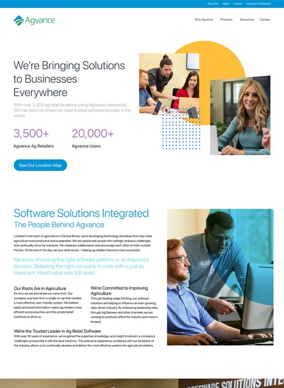 Long-time client, SSI, was taking one of the most dramatic leaps in their history — moving their industry-leading software, Agvance, to a software-as-a-service (SAAS) model and reimagining their user experience. Jump was with them every step of way, starting with evolving the Agvance brand, helping communicate the road map to clients, conducting a user experience audit and designing a new website experience to showcase the virtues of the evolving product.