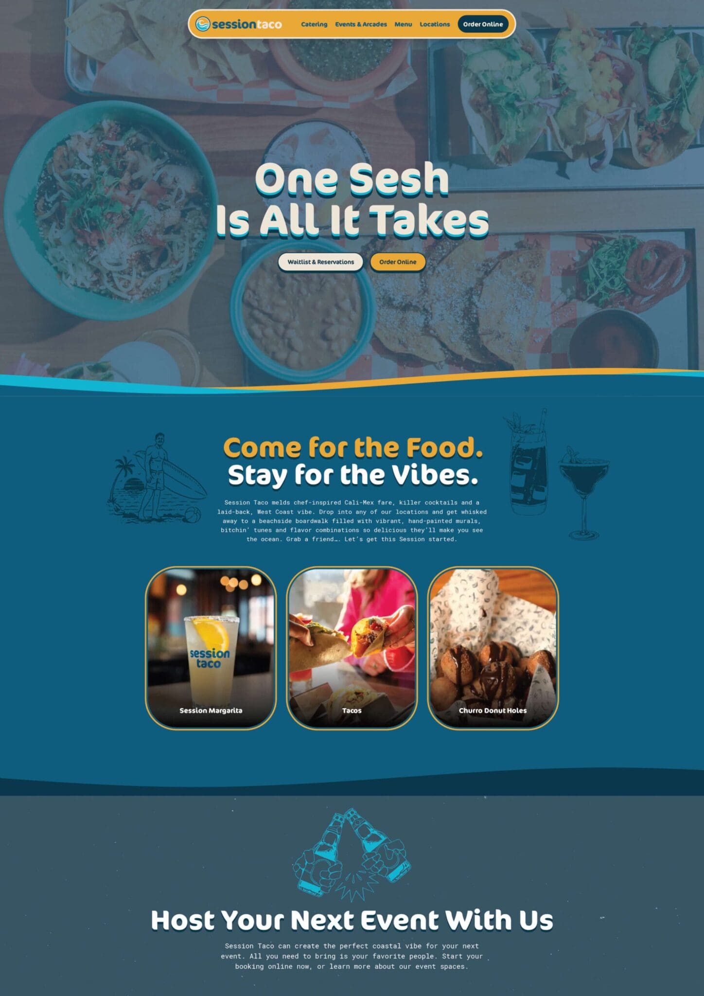 Session Taco is a name inspired by skate and surf culture, where a “session” means time spent doing what you love. In this case, it’s time spent enjoying a casual, hangout-like dining experience. The logo further reflects this heritage, featuring a stylized blue wave and golden sun. This clean, coastal aesthetic is carried throughout the entire brand identity, which is defined by bright colors, fluid designs and a confident yet approachable brand voice.