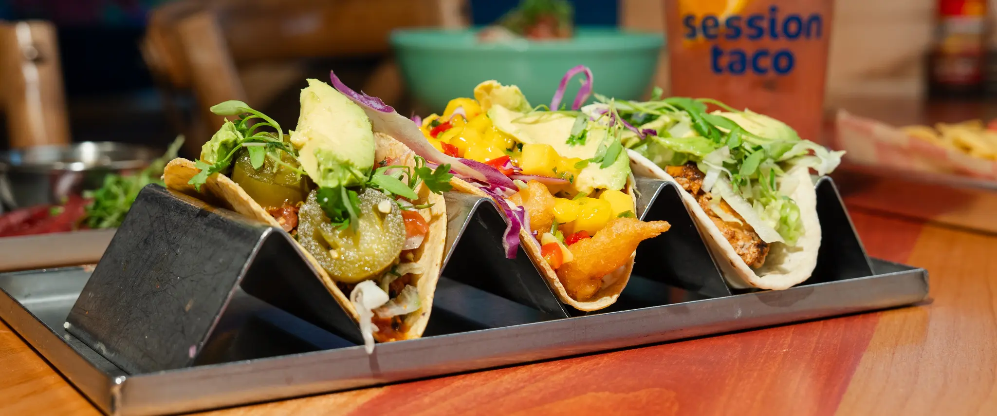 Session Taco is a name inspired by skate and surf culture, where a “session” means time spent doing what you love. In this case, it’s time spent enjoying a casual, hangout-like dining experience. The logo further reflects this heritage, featuring a stylized blue wave and golden sun. This clean, coastal aesthetic is carried throughout the entire brand identity, which is defined by bright colors, fluid designs and a confident yet approachable brand voice.